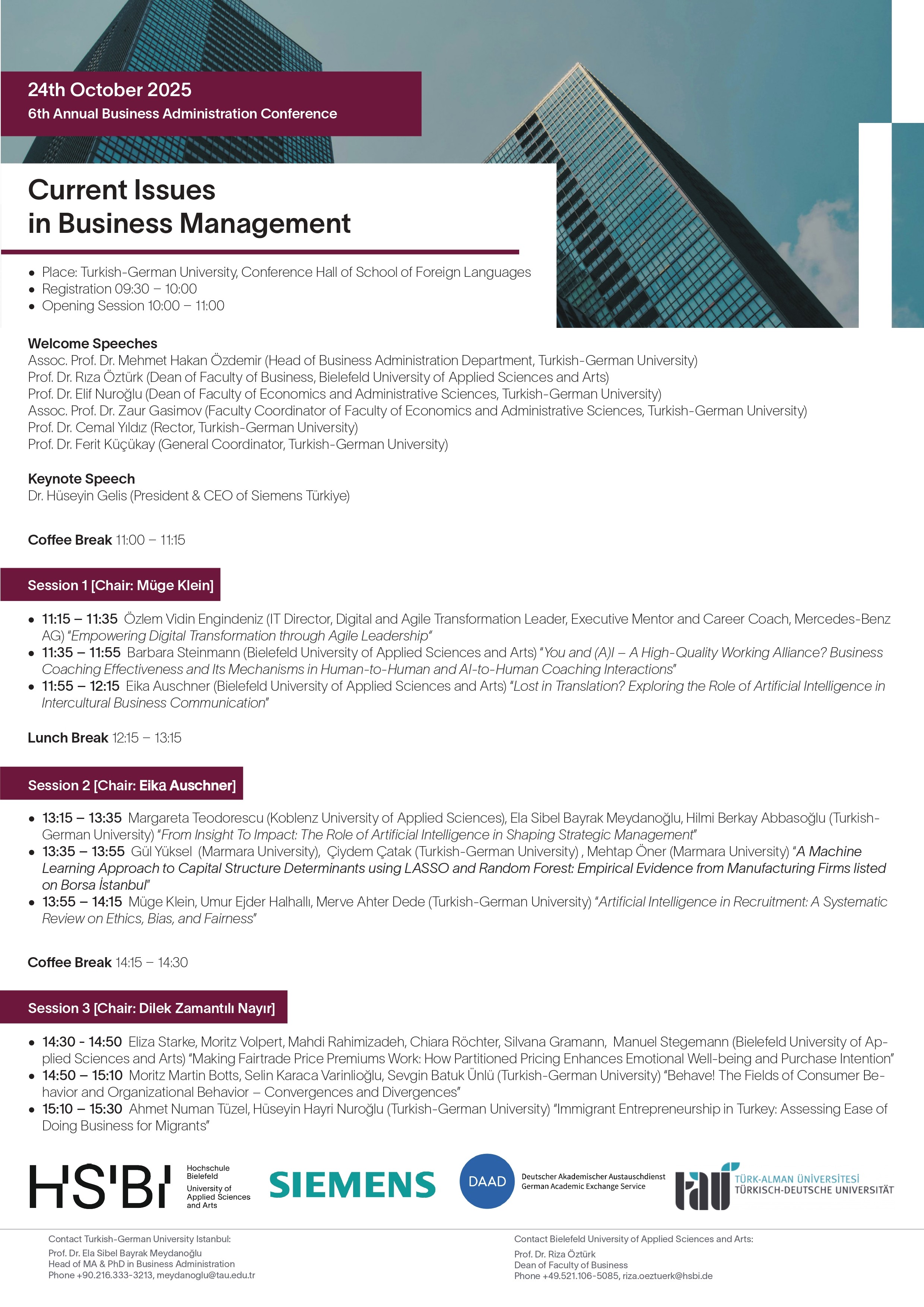 Siemens ve DAAD sponsorluğunda, Türk-Alman Üniversitesi İşletme Bölümü ve Bielefeld Uygulamalı Bilimler Üniversitesi tarafından düzenlenen "The Sixth Annual Business Administration Conference (ABAC): Current Issues in Business Management" başlıklı konferans, 24 Ekim 2025 tarihinde Türk-Alman Üniversitesi Yabancı Diller Yüksekokulu Konferans Salonunda gerçekleştirilecek.