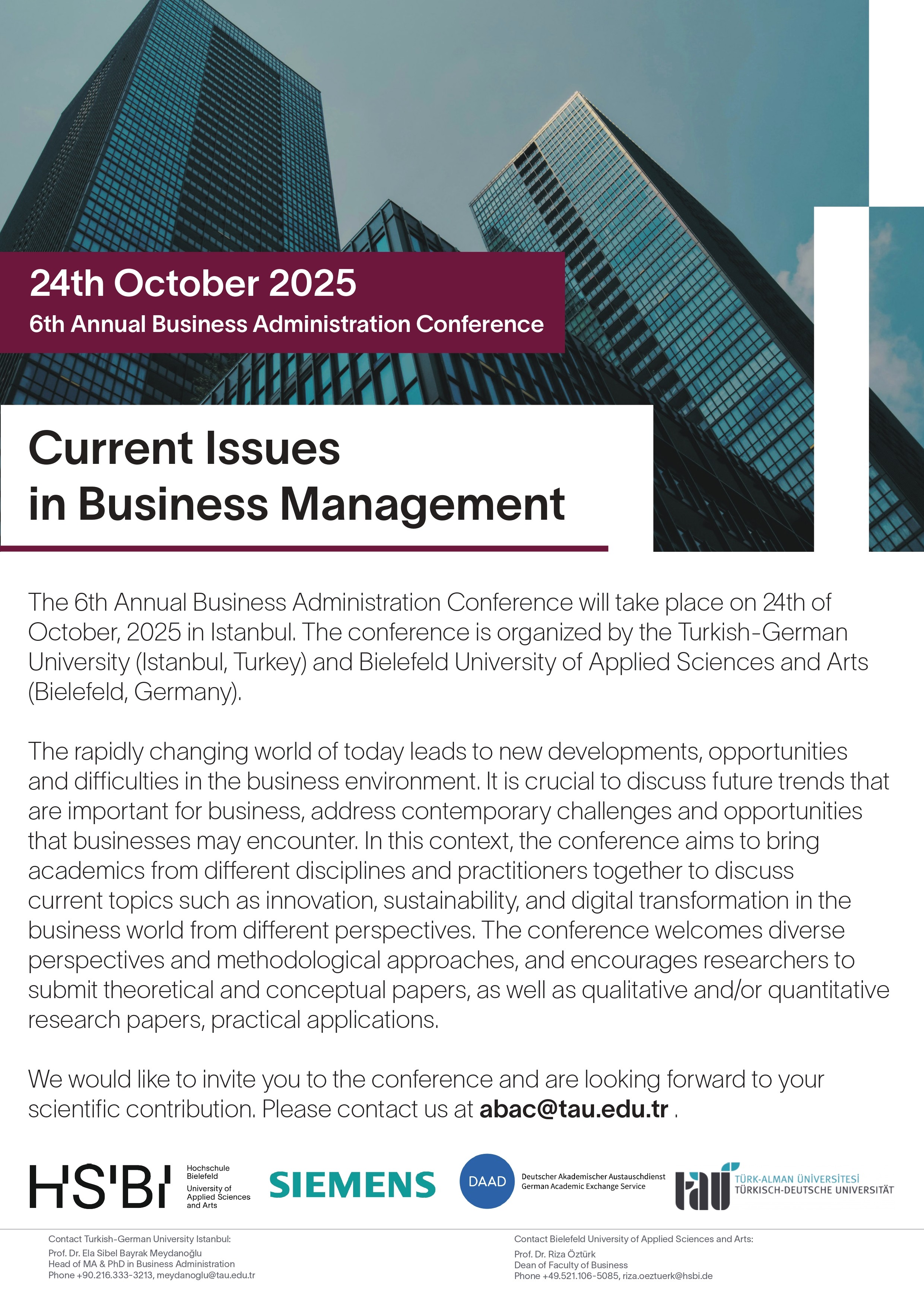 İçerik Siemens ve DAAD sponsorluğunda, Türk-Alman Üniversitesi İşletme Bölümü ve Bielefeld Uygulamalı Bilimler Üniversitesi tarafından düzenlenen "The Sixth Annual Business Administration Conference (ABAC): Current Issues in Business Management" başlıklı konferans, 24 Ekim 2025 tarihinde Türk-Alman Üniversitesi Yabancı Diller Yüksekokulu Konferans Salonunda gerçekleştirilecek.